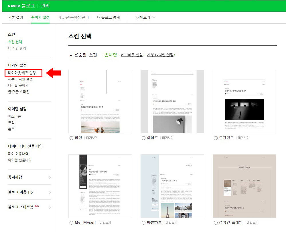 상단의 꾸미기 설정을 선택하고 레이아웃·위젯 설정으로 들어갑니다.