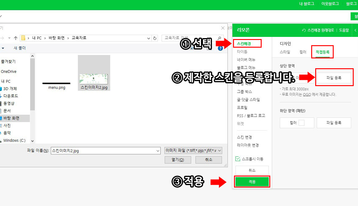 스킨 배경 선택 후 직접등록 선택 제작한 디자인 스킨을 등록하고 적용을 눌러 블로그에 적용시킵니다.