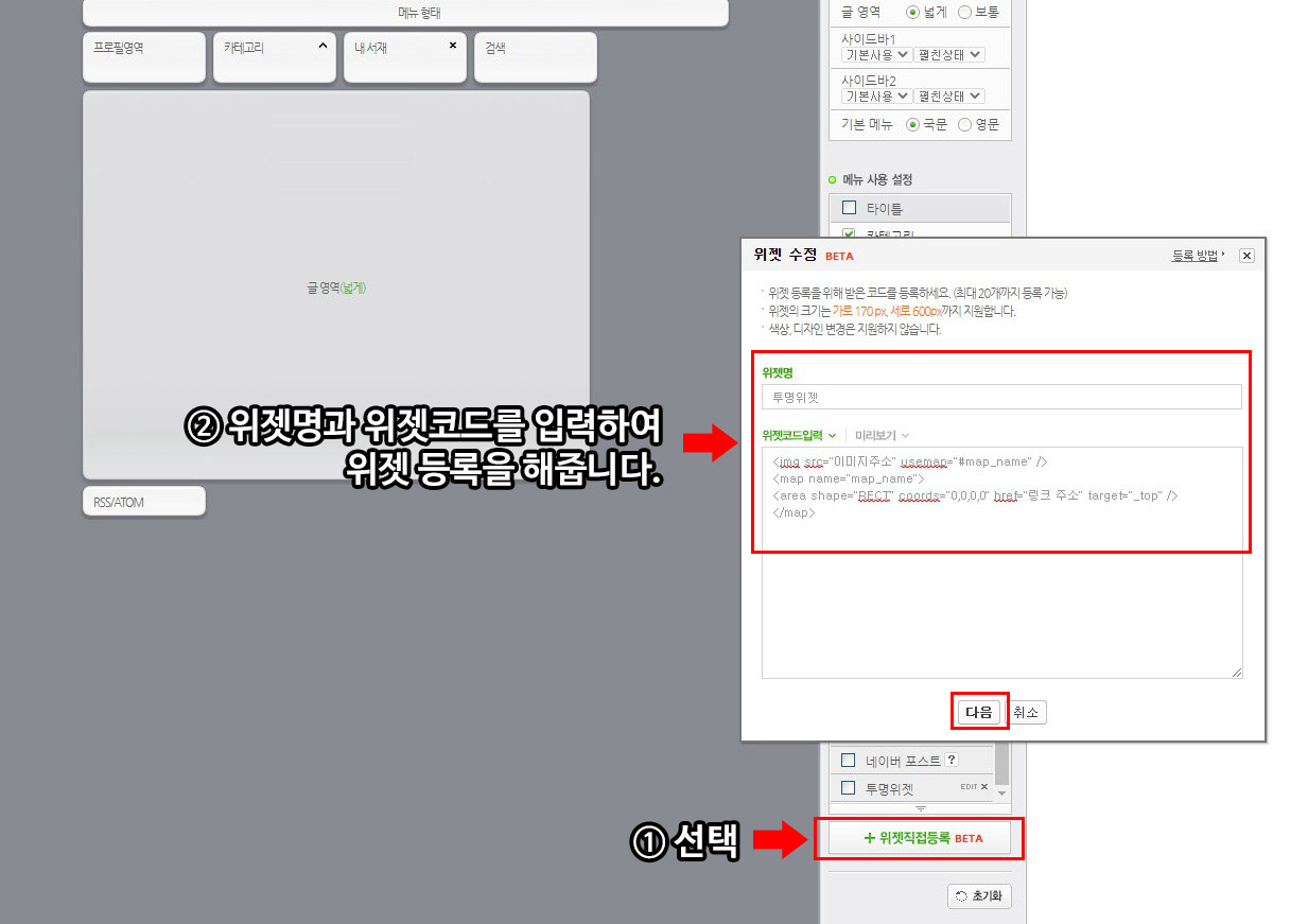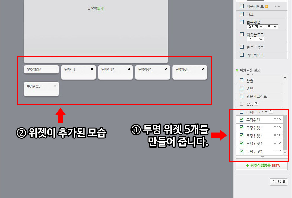 기본적인 설정이 끝나면 아래 위젯직접등록을 눌러 투명위젯을 만들어줍니다.