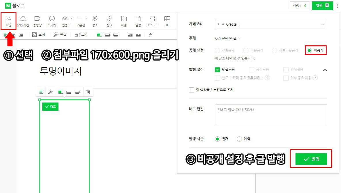스킨 설정에 앞서 블로그 글작성을 눌러 투명위젯용 이미지를 먼저 올려줍니다.