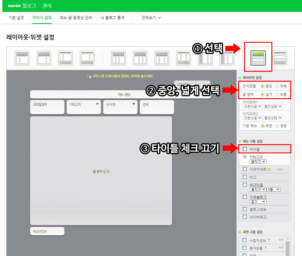 레이아웃 설정 탭에 중앙 정렬, 글 영역 넓게 체크를 해주시고, 타이틀 메뉴는 체크를 해제하여 주세요.