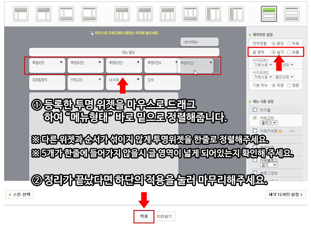 레이아웃 정렬을 마쳤다면, 마지막으로 적용을 눌러 레이아웃을 블로그에 적용 해줍니다.
